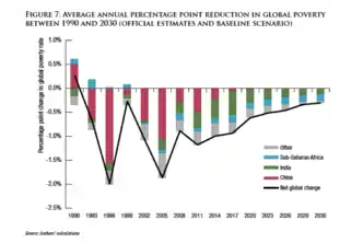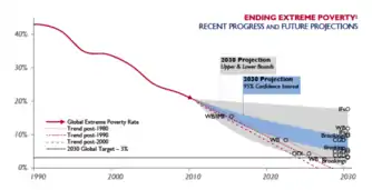 وقد حدث هذا الانخفاض في الفقر المدقع بشكل ملحوظ في الصين وإندونيسيا والهند وباكستان وفيتنام. هذه البلدان الخمسة تمثلت في خروج 715 مليون شخص من الفقر المدقع بين عامي 1990 و2010 - بإجمالي صافي يفوق حوالي 700 مليون شخص. ويمكن تفسير هذه الغرابة الإحصائية بحقيقة أن عدد الأشخاص الذين يعيشون في فقر مدقع في جنوب صحراء إفريقيا قد ارتفع من 290 مليون إلى 414 مليون شخص خلال نفس الفترة.[8] ومع ذلك، هناك العديد من الإشارات الإيجابية للحد من الفقر على المستوى العالمي. منذ عام 1999، انخفض العدد الإجمالي للفقراء المدقعين في المتوسط بمقدار 50 مليون في السنة. علاوة على ذلك، في عام 2005، ولأول مرة في التاريخ المسجل، بدأت معدلات الفقر في الانخفاض في كل منطقة من مناطق العالم، بما في ذلك إفريقيا.[9] على الرغم من أن هذا يرجع إلى حد كبير إلى تغيير في إعلان الأمم المتحدة للألفية 2000، حيث تم تمديد فترة الخطة إلى عام 1990، إلا أنها كانت في السابق ممتدة لعام 1996. وقد استغل تغيير التاريخ النمو السكاني السريع والحد من الفقر بشكل كبير في الصين خلال التسعينات.[10] وكما ذُكر آنفًا، فقد انخفض عدد الأشخاص الذين يعيشون في فقر مدقع من 1.9 بليون إلى 766 مليون على مدى العقود الماضية. إذا واصلنا مسيرتنا الحالية، يتوقع العديد من الاقتصاديين أن نصل إلى "الصفر" العالمي بحلول 2030-2035، وبالتالي "إنهاء" الفقر المدقع. يستلزم الصفر العالمي عالمًا يعيش فيه أقل من 3٪ من سكان العالم في فقر مدقع (المتوقع في ظل أكثر السيناريوهات تفاؤلًا أن يكون أقل من 200 مليون شخص). تم تحديد هذا الرقم "صفر" بنسبة 3٪ اعترافًا بحقيقة أن بعض مقدار الفقر "الاحتكاكي" سيستمر، سواء كان بسبب نزاع سياسي أو تقلبات اقتصادية غير متوقعة، على الأقل في المستقبل المنظور.[11] ومع ذلك، تشير مؤسسة بروكنغز إلى أن أي إسقاط عن الفقر أكثر من بضع سنوات في المستقبل ينطوي على خطر عدم اليقين الشديد. ويرجع ذلك إلى أن التغيرات في الاستهلاك والتوزيع في جميع أنحاء العالم النامي خلال العقدين المقبلين يمكن أن تؤدي إلى تحولات هائلة في الفقر العالمي، للأفضل أو للأسوأ.[12]