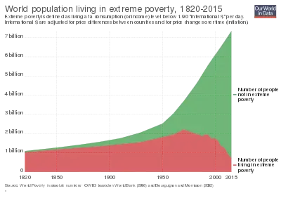 طبقًا لتعريف البنك الدولي لخط الفقر الذي يبدأ من 1.9 دولار في اليوم —اعتبارًا من عام 2016— فما زال هناك 766 مليون شخص تقريبًا في حالة فقر مدقع (أو حوالي 1 من كل 10 أشخاص).[5] يعيش نصف هؤلاء تقريبًا في الهند والصين، حيث يعيش أكثر من 85٪ منهم في 20 دولة فقط. منذ منتصف التسعينات هناك انخفاض ثابت في معدل الفقر على مستوى العالم والعدد الإجمالي للفقراء المدقعين. في عام 1990، بلغت نسبة السكان الذين يعيشون في فقر مدقع 43٪، ولكن في عام 2011 انخفضت هذه النسبة إلى 21٪.[6] هذا الانخفاض في معدل الفقر المدقع يتماشى مع الهدف الإنمائي الأول للألفية (MDG1) الذي اقترحه الأمين العام السابق للأمم المتحدة كوفي عنان، الذي دعا المجتمع الدولي في مطلع القرن إلى "إخفاض نسبة الناس الذين يعيشون في فقر مدقع للنصف ... بحلول عام 2015 ".[7]