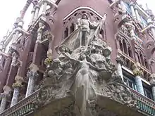 أما بالنسبة للمباني العامة، فكان أهمها التمثالين اللذين تم وضعهما في محاريب على جانبي الباب الأمامي للواجهة الجديدة لفندق دي فيل، الذي يمثل جيمس الأول الفاتح وجوان فيفيلر، الذي صنعه جوزيف بوفر 1844. فقط عكس ذلك، أمام قصر كتالونيا، وفي عام 1871 تم وضع تمثال لسانت جورج الذي يقع أيضا في محراب، الذي صممه أندريو أليو . وكانت هذه الواجهة أيضًا جديدة، حيث إن افتتاح ساحة سانت جاومي في عام 1823 غادر كلا البنايتين المؤسسيتين اللتين تواجهان الواجهة. ولاحظ أنه بعد ذلك لم يأوى البالاو كتالوني هذه المؤسسة و قد ألغيت من المرسوم الخاص بالمصنع الجديد، ولكن بالمحكمة الملكية، والمجلس الإقليمي والأرشيف العام لتاج أراغون.[18]