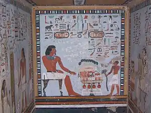 قد نجت العديد من اللوحات المصرية القديمة في المقابر وفي بعض الأحيان في المعابد بسبب مناخ مصر الجاف للغاية. وغالبا ما كانت ترسم اللوحات بقصد جعل الحياة الآخرة سارة للمتوفى. وشملت المواضيع رحلة عبر العالم الآخر أو الآلهة القائمين على إدخال المتوفى إلى آلهة العالم السفلي (مثل أوزوريس). وتظهر بعض لوحات المقابر الأنشطة التي شارك فيها المتوفى عندما كان على قيد الحياة وكانوا يرغبون في الاستمرار في العمل إلى الأبد.