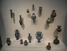 الفاينس المصنوع من السيليكا والذي تم العثور عليه على شكل كوارتز في الرمل والجير والنطرون تم إنتاج قطع صغيرة ورخيصة وجذابة نسبياً في مجموعة متنوعة من الألوان وكانت تستخدم لمجموعة متنوعة من أنواع الأشياء بما في ذلك المجوهرات. يعود الزجاج المصري القديم إلى التاريخ المصري المبكر ولكنه كان في البداية مادة فاخرة للغاية. في فترات لاحقة أصبح شائعا وكثيرا ما وجدت جرار صغيرة مزينة بدرجة عالية للعطور والسوائل الأخرى كسلع خطيرة.[9]