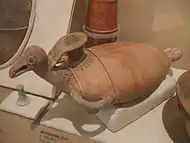 تم إيداع أنواع مختلفة من المواد الفخارية في مقابر الموتى. وضع في بعض الأصناف الفخارية أجزاء داخلية من الجسم مثل الرئتين والكبد والأمعاء والتي أزيلت قبل التحنيط. كما تم إيداع عدد كبير من الأجسام الصغيرة في فخار المينا مع الموتى. كان من المعتاد وضع أقماع كغطاء للفخار التي يتراوح طولها بين ستة وعشرة إنشات والتي كانت عليها أساطير منقوشة أو معبرة تتعلق بالساكنين الموتى في المقابر. وعادةً ما تحتوي هذه الأقماع على أسماء المتوفين وألقابهم التي كانوا يحملونها وبعض التعبيرات المناسبة لأغراض الجنازة.