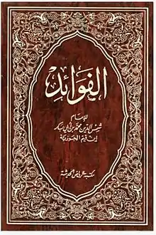 الفوائد. هو كتاب من تأليف الشيخ ابن قيم الجوزية، وهو من علماء القرن الثامن الهجري ولد بدمشق عام 1292م، وتوفي عام 1350م، ودرس على ابن تيمية، ضم الكتاب فوائد لطيفة مختلفة ومنافع جمة من مسائل علمية نادرة متنوعة فيها غوص في معاني الحقائق الربانية، وإيضاح لحكمة الشريعة في موضوعات متعددة تتعلق بالقرآن والسنة النبوية والفقه الإسلامي.[1]
