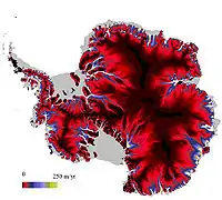 خريطة تبين سرعات تدفق الجليد. الألوان المختلفة تبين سرعات التدفق المختلفة