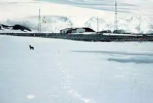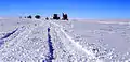 قاعدة Amundsen-Scott Station, والقطب الجنوبي الجغرافي معلم في خلفية الصورة (عام 2006)