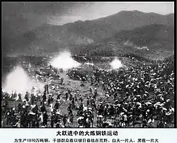 وقد تم بذل جهود ضخمة من الفلاحين وغيرهم من العمال من أجل إنتاج الصلب من المعادن الخردة. ولتغذية تلك الأفران بالوقود، كانت الحكومة المحلية تقوم بقطع الأشجار، بالإضافة إلى الأخشاب التي يتم الحصول عليها من أبواب ومنازل الفلاحين. وكانت تتم مصادرة الأواني والمقالي وغيرها من المصنوعات المعدنية من أجل توفير "الخردة" للأفران، حتى يمكن الوفاء بأهداف الإنتاج المتفائلة للغاية. وقد انتقل العديد من العمال الزراعيين من الحصاد من أجل المساعدة في إنتاج الحديد، كما فعل نفس الأمر العديد من عمال المصانع والمدارس وحتى المستشفيات. ورغم أن النتائج كانت تمثل كتلاً منخفضة الجودة من الحديد التي كانت قيمتها الاقتصادية متدنية للغاية، كان ماو يفقد الثقة بشكل كبير في المثقفين وإيمان عميق في قوة التعبئة الجماهيرية من الفلاحين.