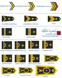 - فيس أميرال (نائب أميرال) هي الرتبة الأعلى التي وصلها الضباط المغاربة، ويحملها الآن محمد المغاري مفتش البحرية الملكية