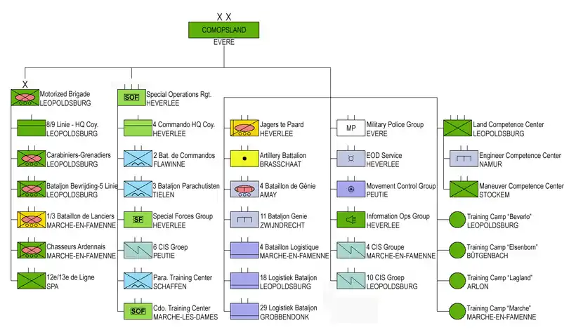 الجماعات الأمر قدرة المستويات التالية من الأمر: COMOPSLAND (قيادة عمليات مكون أرض)، اللواء متوسطة في Leopoldsburg (تشكلت من 1 لواء اليا في عام 2011) وضوء لواء (سابقا اللواء اليا 7) في مارتش-EN-فامين.