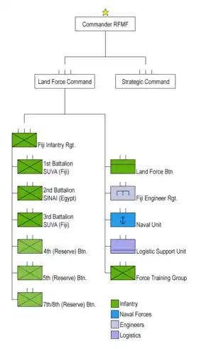 تنقسم القوات البريَّة الفيجيَّة إلى ستة كتائب مشاة وكتيبة هندسيَّة واحدة يبلغ مجموع أفرادها جميعاً إلى نحو 6000 فرد احتياط. كان هناك في السابق قوة خاصة وحيدة في فيجي تعرف باسم الوحدة الحربيَّة الثوريَّة المضادة نشطت خلال الفترة الممتدة من عام 1987 حتى حلّها في عام 2000 بسبب تمرد بعض أفرادها.[1][2]