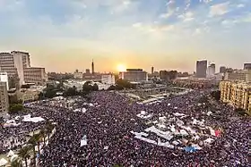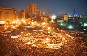 في يوم 25 يناير 2011 -وهو اليوم الموافق لعيد الشرطة- انطلقت مجموعة من المظاهرات والاحتجاجات الشعبية ذات الطابع الاجتماعي والسياسي[78][79] في ميدان التحرير وعدة ميادين مصرية كبرى وشاركت بها العديد من فئات الشعب المصري، والتي دعت إليها المعارضة والمستقلين، ومن بينهم حركة شباب 6 أبريل وحركة كفاية ومجموعة كلنا خالد سعيد على شبكة التواصل الاجتماعي فيس بوك والجمعية الوطنية للتغيير وجماعة الإخوان المسلمين. كان شعار هذه الثورة هو «عيش، حرية، عدالة اجتماعية»، وذلك نتيجة عدة أسباب منها سوء وتدهور الأوضاع المعيشية للمواطنين، شعور طوائف وفئات الشعب المصري بالضغط نتيجة الظروف الداخلية للبلاد، والانتخابات البرلمانية التي أقصت كل فصائل المعارضة. وفي يوم 28 يناير (جمعة الغضب) ساهمت العديد من الطوائف المصرية على نطاق واسع، وزادت حدة المظاهرات مع حوادث قتل ودهس المتظاهرين بالإضافة إلى استخدام القوة والعنف الزائد من قبل الشرطة لإخماد المظاهرات، بالإضافة إلى قطع خطوط الإنترنت وشبكات الهواتف المحمولة، مما تسبب في حدوث فوضى عارمة على مستوى الجمهورية أعقبها قيام قوات الشرطة بالانسحاب من كافة مقارها وحدوث فراغ أمني مما تسبب في انتشار حالات السرقة والنهب، مما دفع رئيس الجمهورية في نفس اليوم إلى إعلان حالة الطوارئ وفرض حالة حظر تجول شملت بعض المحافظات ما لبثت حتى تحولت إلى حظر تجول لكل محافظات مصر.[80]