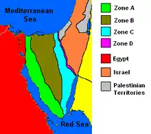 - المنطقة ب: بين الخط أ والخط ب . يسمح لمصر بأربع كتائب أمن حدودية لدعم الشرطة المدنية في المنطقة ب.