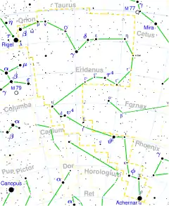| Cursa/Kursa,[9] Dhalim,[10] β Eri, Beta Eridani, Beta Eri, تسمية فلامستيد, 67 Eri, BD−05 1162, CCDM J05079-0506A, فهرس النجوم الأساسية 188, GC 6274, فهرس غليس للنجوم القريبة 9175, HD 33111, هيباركوس 23875, فهرس النجم الساطع 1666, IDS 05030-0513 A, فهرس موقع النجم وحركتة الحقيقية 187729, فهرس مرصد سميثسونيان للفيزياء الفلكية 131794, WDS 05078-0505A.[11] | |