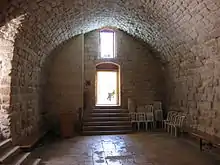 في طابق الكنيسة السفلي توجد مغاور تعود إلى القرن الأول وتشكل جزءًا من القرية القديمة، فيها جرن مع رموز لسر العماد ترقى إلى عهد الجماعة المسيحية الأولة وسبع درجات ترمز إلى مواهب الروح القدس، وبركة مرصوفة بالفسيفساء عليها رموز لستة أجواق الملائكة، والحجر في وسط البركة يرمز إلى المسيح، وعلى جدران البركة قناة صغيرة ترمز إلى نهر الأردن.[4]