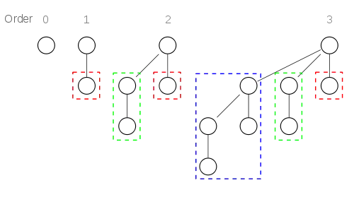 - الشجرة ذات الحدين ذات الرتبة k تمتلك عقدة جذر بحيث بكون أولاد هذه العقدة بدورهم جذوراً لأشجار ذات الحدين رتبها تتدرج على الشكل التالي: 0، 1، 2، ... k-1، k-2