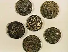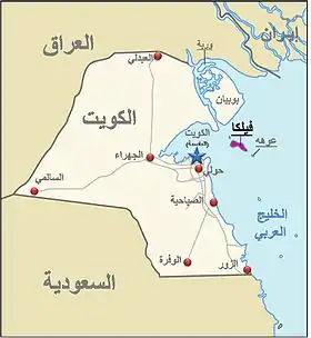 - جزيرة فيلكا: هي الجزيرة الوحيدة التي استوطنها الكويتيون. وتقع في الركن الشمالي الغربي من الخليج العربي على بعد 20 كيلومتر من سواحل مدينة الكويت.[181] كانت محطة تجارية مهمة على الطريق البحري بين حضارات بلاد ما بين النهرين والحضارات المنتشرة على ساحل الخليج العربي،[182] اعتبرت الجزيرة مركزا دينيا قديمًا ذا شأن مهم في الخليج في العصور القديمة.[181] كذلك كانت سبّاقة في تأسيس إحدى أول المراكز الحضرية في منطقة الخليج العربي، فخلال العصر الدلموني، أي منذ حوالي 3000 سنة ق.م في الفترة التي شهدت بروز الحضارة الإنسانية في البحرين، كان سكان فيلكا قد أسسوا حضارتهم وديانتهم الخاصة. يُعتقد بأن إحدى الكلمات التي اشتُق منها اسم "فيلكا" هي الكلمة الاغريقية "فيلاكيو" (باليونانية القديمة: φυλάκιο)، التي تعني نقطة تمركز أو موقع بعيد.[183]