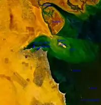 - جزيرة وربة: تقع في شمال الكويت قبالة السواحل العراقية. ترجع تسميتها نظرًا لشكلها المنخفض والمائل. قفي لسان العرب (الوربة) تعني هي الحفرة التي أسفل.[184][185] تتميز بمجموعة كبيرة من الأخوار التي تغطى عادة بمياه المد.[186] تعدّ الجزيرة محمية جيدة للطيور والحيوانات المائية،[187] فيكثر فيها طائر النورس وسمكة نطاط الطين والتي يعرف باسم بوشلمبو.[188][189]