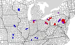 ![]() خريطة كثافة متحدثي اللغة الألمانية البنلسفانية في نواحي الولايات المتحدة. | ||||