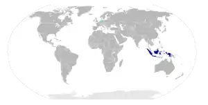 | الدول | إندونيسيا، ماليزيا، بروناي، سنغفورة، جنوب الفلبين وتايلند، تيمور الشرقية، أستراليا، سورينام، كاليدونيا الجديدة، هولندا، الولايات المتحدة | |||