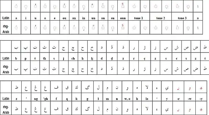 ترجع أولى الكتابات بلغة الروينغا المكتوبة بالخط العربي إلى أكثر من 200 عام مضى.[1] واعتمدت طريقة للكتابة بالحروف العربية والأردية في عام 1975. الحروف وعلامات التشكيل العربية الروهنغية متوفرة للحاسوب. [1] [2]