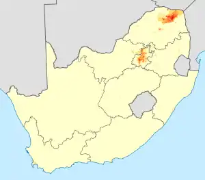 ![]() {{{mapalt2}}} Geographical distribution of Tshivenda in South Africa: density of Tshivenda home-language speakers.