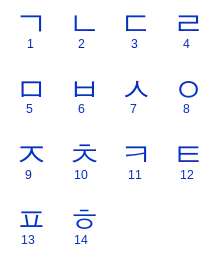 | هانغول | ㅂ | ㄷ | ㅈ | ㄱ | ㅍ | ㅌ | ㅊ | ㅋ | ㅅ | ㅎ | ㅁ | ㄴ | ㅇ | ㄹ | ㅃ | ㄸ | ㅉ | ㄲ | ㅆ |