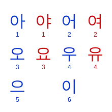 | هانغول | ㅏ | ㅑ | ㅓ | ㅕ | ㅗ | ㅛ | ㅜ | ㅠ | ㅣ | ㅡ | ㅔ | ㅐ | ㅖ | ㅒ | ㅚ | ㅟ | ㅞ | ㅙ | ㅘ | ㅝ | ㅢ |