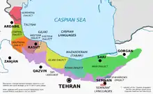 خريطة لإيران وعليها المناطق التي يتحدث أهلها الطبرية ، ديلمي ، جيلكي ، تالشي ، سمناني و شهميرزادي