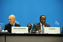 باسكال لامي من فرنسا، المدير العام لمنظمة التجارة العالمية (يسار) واولوسيجون Olutoyin Aganga من نيجيريا، رئيس الدورة الثامنة