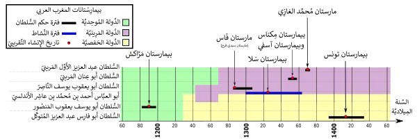 و قد بنى السلطان أبو عنان ابن أبي الحسن المريني بمدينة سلا المارستان العجيب وسط حارة اليهود من حومة باب حسين، وهو بناء حفيل مشتمل على بيوت كثيرة لاستقرار المرضى والمجانين والحمقى بها، وأجرى له الماء لشدة الحاجة إليه من الماء الداخل على سور أبيه ( أي سور الأقواس).