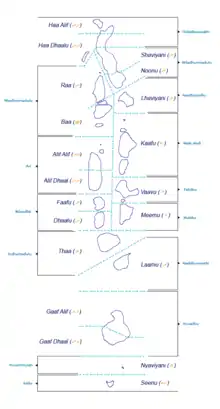 جزر المالديف تشمل تقريباً 1.190 جزيرة مرجانية جمعت في سلسلة مضاعفة من 26 جزيرة مرجانية.