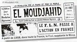 جريدة المجاهد (بالفرنسية: El Moudjahid) جريدة جزائرية[2][3] صدرت باللغتين الفرنسية [4] ثم العربية [5] في الأعوام من 1956م إلى 1962م خلال حرب التحرير الجزائرية، وكانت اللسان الرسمي لجبهة التحرير الوطني الجزائرية. وقد تركزت المادة الخبرية على الدفاع والتعبير عن أفكار جبهة التحرير الوطني وإبراز أصالة الشعب الجزائري والعمل على تدويل القضية الجزائرية وفضح أساليب ودعاية العدو أمام الرأي العام المحلي والعالمي.[6]
