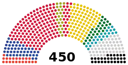 | بسبب التدخل العسكري الروسي في أوكرانيا وضم القرم إلى الاتحاد الروسي، تم انتخاب فقط 423 نائب من أصل 450 مقعد تم الانتخاب عليها[1] | |