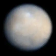 المريخ هو رابع الكواكب بعدا عن الشمس حيث يفصل بينهما ما يعادل 1.5 و.ف. هو أصغر حجما من الأرض والزهرة. هو جار الأرض المشهور بكونه الكوكب الحي الآخر. يَظهر المريخ في سماء الأرض قرصا برتقاليا-مُحمَرا لامعا. لونه الأحمر ناتج عن وجود أكسيد الحديد (الصدئ) في تربته. توجد دلائل قوية على أن الماء كان يتدفق في يوم ما على سطح المريخ، بما في ذلك آثار الخنادق والقنوات والأودية التي يُعتقد أنه قد حفرتها المياه. كما أنه قد عثر على دليل في أحد النيازك التي وصلت إلى الأرض من المريخ على وجود حياة عليه، لكن ما زال الجدل قائماً بشأن مدى صحة هذا الدليل. وأيضاً هناك العديد من الآثار لنشاطات بركانية في الماضي على سطح الكوكب، إضافة إلى العديد من الفوهات الاصطدامية الضخمة. ومع أن غلافه الجوي قليل الكثافة مقارنة بالأرض، إلى أنه كاف للسماح بتكون السحب والرياح إضافة إلى العواصف الرملية على السطح.[72] يَملك المريخ أيضاً قطبين متجمدين تماماً كقطبي الأرض، وتتغير مساحتهما مع مرور الفصول (الموجودة أيضاً على ذلك الكوكب). يَدعو هذا الشبه كله بالأرض العديدين إلى الاعتقاد بوجود حياة على هذا الكوكب بشكل خاص، وإلى الترويج إليه كثيراً على أنه كوكب المخلوقات الفضائية. يَملك المريخ قمرين هما فوبوس وديموس. مع أنهما لا يُشبهان قمر الأرض أبداً، فهما أصغر بكثير منه وأشكالهما غير منتظمة.[73]