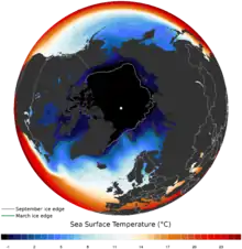 درجة حرارة سطح المحيط الشمالي إلى حد ما ثابت، قريب إلى نقطة التجمد لمياه البحر. يجب أن تصل درجة حرارة المحيط - 1.8 درجة مئوية قبل حدوث التجمد لأنه يتكون من مياه مالحة. كثافة مياه البحر عكس المياه العذبة، تزداد كلما أقتربت من درجة التجمد، وبالتالي فإنها تتجه إلى الغرق. بصفة عامة من الضروري أن تكون الطبقة من 100-150 متر العلوية من مياه المحيطات أن تبرد إلى درجة التجمد لتشكيل جليد البحر [21] إن مياه المحيط الدافئة نسبيا في فصل الشتاء لها تأثير معتدل، حتى عندما يغطيها الجليد. وهذا هو أحد الأسباب استحالة أختبار درجات الحرارة القصوى للقطب الشمالي كما في القارة القطبية الجنوبية.