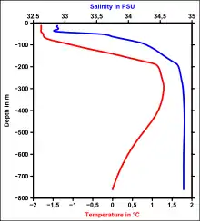 في أغلب الأجزاء من المحيط المتجمد الشمالي دائما الطبقة العليا تكون أقل ملوحة واخفض درجة حرارة مثل بقية. ولا تزال البقية مستقرا نسبيا وذلك لأن تأثير الكثافة على الملوحة أكبر من تأثير درجات الحرارة. إنها تتغذى بالمياه العذبة من الأنهار السيبيرية والكندية، والمياه الشبه طافية على السبخات، والأكثر كثافة ومياه المحيطات العميقة. إن بين طبقة الملوحة القليلة والأجزء الكبرى التي تكمن في المحيط تسمى انحدار الملوحة [الإنجليزية]، وفي كلاهما تزداد الملوحة والحرارة مع زيادة العمق. إن الفرق في درجة الحرارة بين أسطح المحيطات الباردة والاعماق الأكثر دفئا تسبب دوامات حمل حرارية تتوقف عند الهبوط الحراري، ويبقى فقط التوصيل الحراري مثل آلية نقل الحرارة التصاعدية، التي تتطلب جهدا اقل. بدون هذا التأثير العاز سيكون هناك جليد بحري أقل بكثير في القطب الشمالي. يمكن أن يكون نمط الملوحة والحرارة من المحيط المتجمد الشمالي معقد تماما، وتصبح معتمدة على التدفق المختلف داخل وخارج منطقة القطب الشمالي.[16][17]