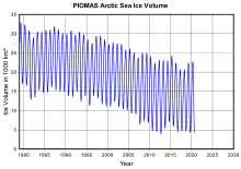 | التغيرات الموسمية والانخفاض المستمر لمساحات الجليد البحري للمحيط الشمالي.[18] | التغيرات الموسمية والانخفاض المستمر لحجم الجليد البحري للمحيط الشمالي.[19] |