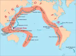 للمحيط الهادئ سلاسل جبال بحرية طويلة متعددة (سلاسل من الجبال مغمورة في قاع المحيط) شكلتها البراكين الساخنة. "الحزام الناري" هو أكبر حزام من البراكين المتفجرة في العالم. غير أنه سمي بهذا بعد عدة مئات من البراكين النشطة الواقعة فوق مناطق الاندساس المختلفة (وهي عملية الجيولوجية لتحرك حافة صفيحة قشرة جانبية هبوطاً وتغطى تحت صفيحة أخرى).