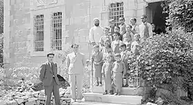 ![]() الأستاذ صبحي طاهر الدجاني مع طلابه أمام المدرسة العلائية للمكفوفين في مدينة الخليل، فلسطين | |