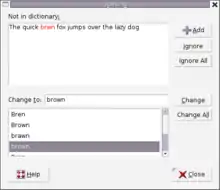 - في بعض البرامج ، تعتبر ميزة المدقق الإملائي (أو التدقيق الإملائي ) ميزة برمجية للتحقق من الأخطاء الإملائية في النص . غالبًا ما يتم تضمين ميزات التدقيق الإملائي في البرامج أو الخدمات، مثل برامج معالجة النصوص أو برامج عميل البريد الإلكتروني أو برامج القاموس الإلكتروني أو محركات البحث .