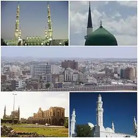 ![]() أعلى اليمين: القبة الخضراء مع مئذنة باب السلام، أعلى اليسار: منارتان تابعتان للمسجد النبوي، في الوسط: منظر لأحد أجزاء المدينة ويظهر جزء من مقبرة البقيع بالأسفل، أسفل اليمين: مسجد قباء، أسفل اليسار: متحف سكة الحجاز | |