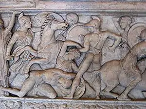 معركة أمازونوماتشي بين اليونانيين والأمازون، وإغاثة التابوت - ج. 180 قبل الميلاد، وجدت في سالونيك، 1836، والآن في متحف اللوفر، قسم الآثار اليونانية