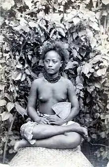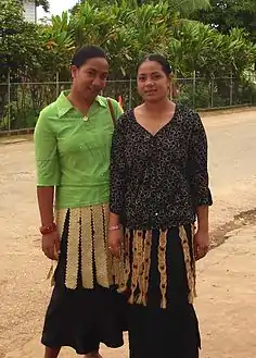 ![]() شابتان من تونغا في العصر الحديث، كلاهما يرتدين ملابس مع الاكسسوار المعروفة باسم kiekie أو "حزام الزينة". شابتان من تونغا في العصر الحديث، كلاهما يرتدين ملابس مع الاكسسوار المعروفة باسم kiekie أو "حزام الزينة". | |