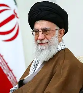 - علي خامنئي هو القائد الثاني للثورة الإسلامية الإيرانية، وقد تم "انتخابه" في 3 حزيران 1989م في اليوم التالي من رحيل الإمام الخميني بأكثرية الآراء.[5]