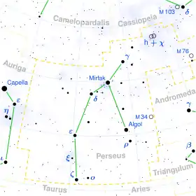 | Mirfak, Mirphak, Marfak, Algeneb, Algenib, α Persei, α Per, Alpha Per, 33 Persei, فهرس النجوم+49 917, CCDM J03243+4951A, فهرس النجوم الأساسية 120, GC 4041, فهرس هنري درابر 20902, هيباركوس 15863, فهرس النجم الساطع 1017, IDS 03171+4930 A, PPM 46127, فهرس مرصد سميثسونيان للفيزياء الفلكية 38787, WDS J03243+4952A. | |