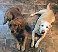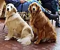 علي اليمين يجلس كلب مسترد فاتح اللون وشعره قصير، بينما علي اليسار يجلس كلب مسترد غامق اللون شعره اطول واكثف .