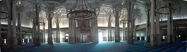 - الأعمدة: تشكل مساحات رمزية للرواق. كل عمود يضم، كرزمة، أربعة أعمدة تتفرع في الجزء العلوي لنفس العمود، وتنحني خارجياً مشكلة أربعة فروع منحنية إلى الأعلى كأغصان الشجر. وهذه الأعمدة تشكل العناصر الخارجية والداخلية المميزة للمسجد. يدخل الضوء الطبيعي للقاعة من سلسلة من الفتحات الموجودة في القبة.