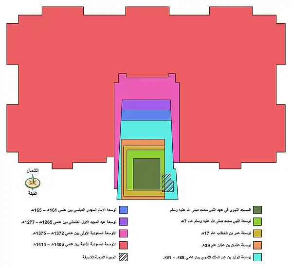 | التوسعة الأولى | 7 هـ 628م | النبوي | النبي محمد | 2,475 | 136% | 3 | - | تمت بعد غزوة خيبر |
