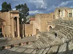 - "المسرح الروماني بقالمة.. جوهرة حافظت على أسرارها على مدار العصور". الشروق أونلاين. 2019-02-27. مؤرشف من الأصل في 04 نوفمبر 2020. اطلع عليه بتاريخ 04 نوفمبر 2020. الوسيط