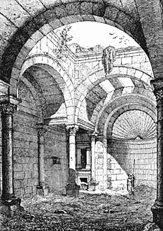 مساحة كبيرة عمارة متقنة قناطر[؟] وأقواس مرتكزة على أعمدة وتيجان كورنثنية صدر البناء عبارة عن حنية نصف دائرية كبيرة الحجم يعلوها شكل صدفي وسط أقواس نصف دائرية تتوالى امتداداً باتجاه الأمام مع أقواس بمحاريب من كافة الجهات وهو يشابه لحد ما لمعبد الآلهة تيكة في خبب والصنمين المماثل له بفترة البناء. في عهد الأحتلال العثماني في أواخر القرن التاسع عشر الميلادي حول الأتراك القلعة إلى مخفر عثماني (كركون) وذلك عن طريق هدمه بشكل كامل ثم إعادة بنائه بطراز متكرر بالاعتماد على عناصر البناء السابق وجلب عناصر أخرى من محيط الموقع ,والبناء مستطيل الشكل مؤلف من طابقين أبعاده 45×18م حيث تتوزع الغرف على حهاته الثلاث باستثناء الجهة الجنوبية.وللقلعة مدخلين واحد من الجنوب والآخر من الشمال يقود عبر درج حجري للطابق الثاني أبعاد كل مدخل 2.5×3>