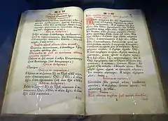 2. قوانين الرسل: وهي قوانين الديدسكاليا والديداخي. يعد الكتاب المصدر التشريعي المسيحي الثاني بعد الكتاب المقدس في الكنائس التقليدية ويضم تعاليم وأقوال وقوانين الرسل.[219] ويُعالج الكتاب كثيرًا من نواحي الحياة المسيحية، وسيمّا حياة الأسرة المسيحية والزاوج. ويعالج في إسهاب واجبات الأسقف، وموضوع التأديبات الكنسيَّة، والعبادة الليتورجيَّة، وكذلك موضوع الأرامل والشماسات.[220] وتحوي الديداخي على دروس مسيحية وشعائر دينية مثل التعميد وتنظيم الكنيسة.[221]